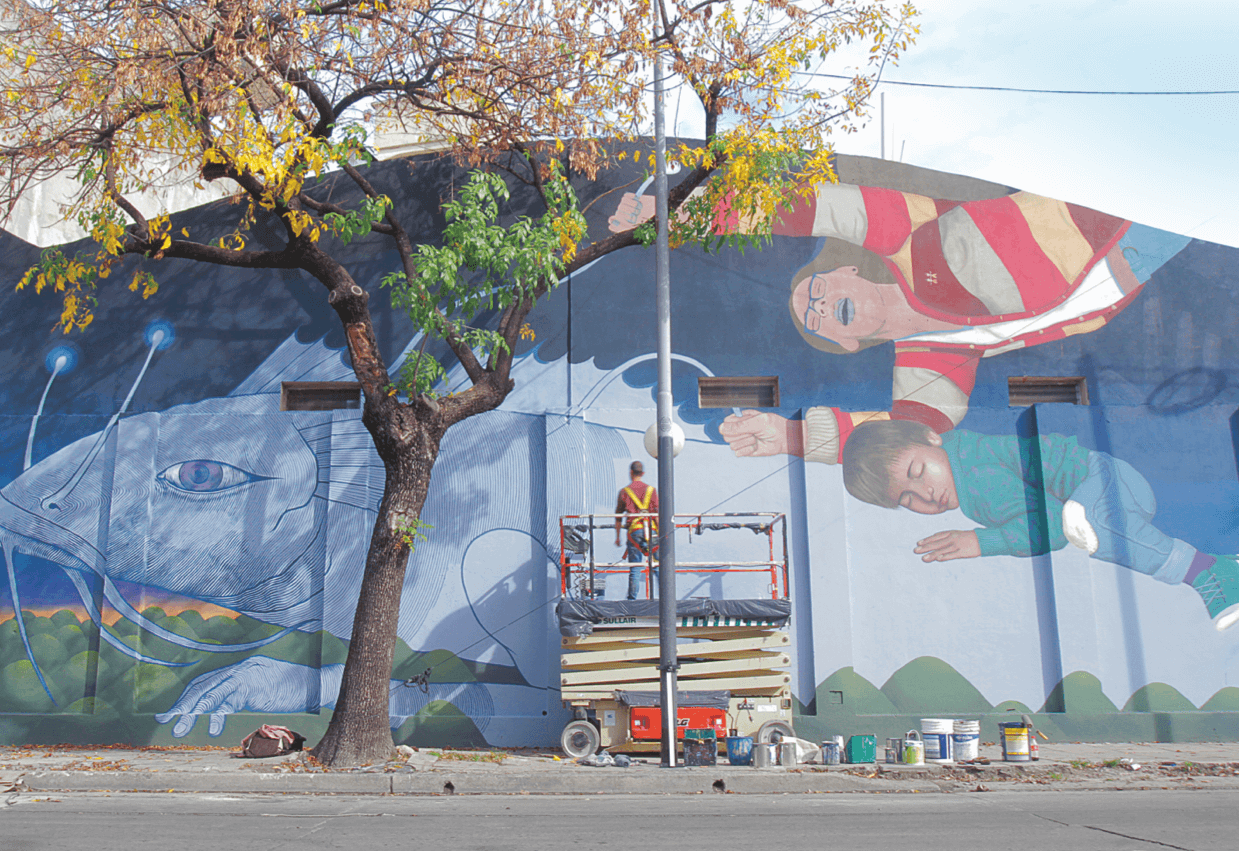 Un enorme sueño vertical que nos eleva a un limbo de habitantes oníricos y realidad transpuesta. Niños cabalgando sobre peces que vuelan por las aguas mansas o nadan por un aire sin turbulencias. Infancia cumpliendo su rol, naturalizando un pez que es también iguana, axolote y dragón. Un monstruo bueno que garantiza el equilibrio natural de la fantasía y la realidad; seguramente escapado de algún impreso gigantesco de algún viejo libro al que no quiere volver.