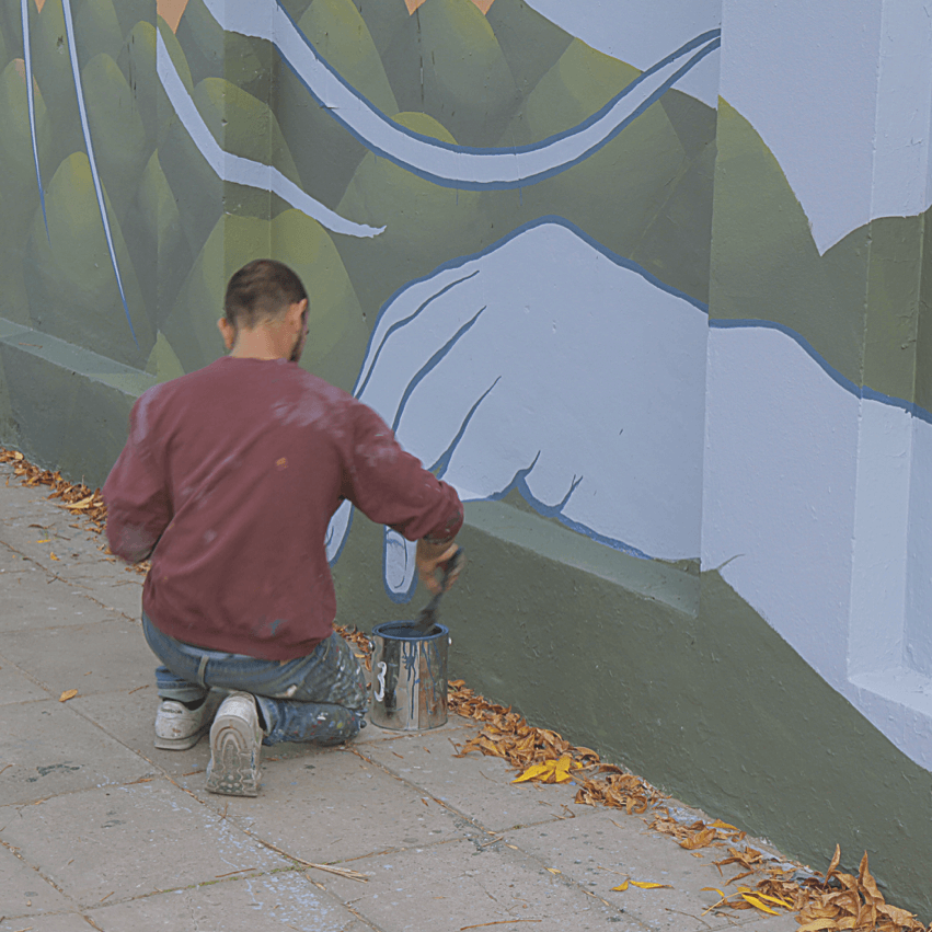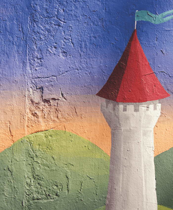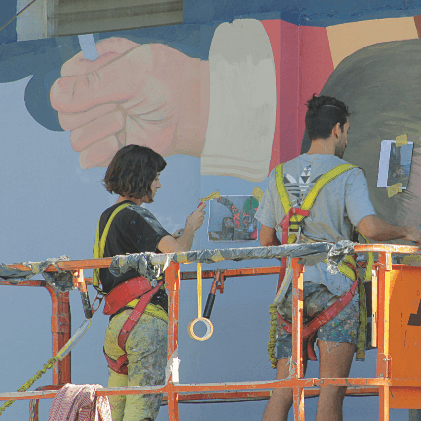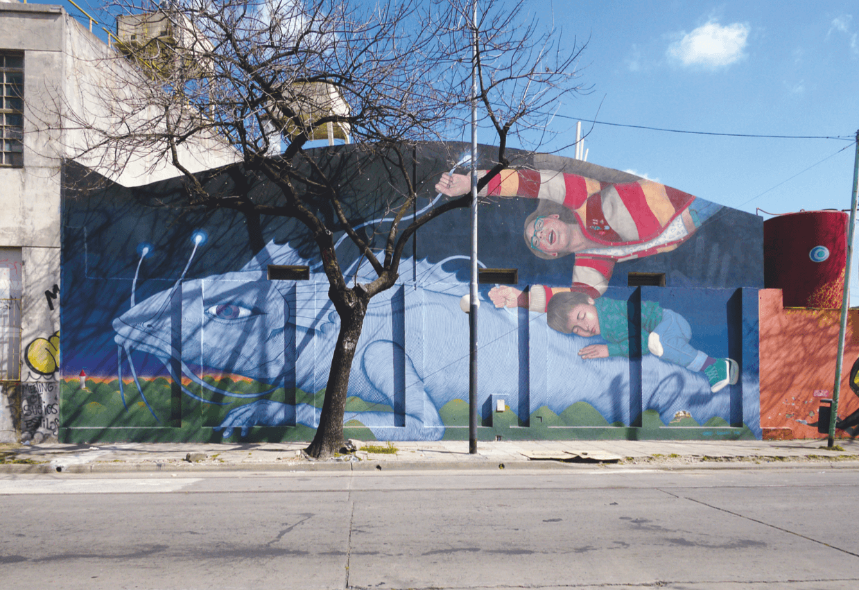 Niños cabalgando sobre peces que vuelan por las aguas mansas o nadan por un aire sin turbulencias.Volver a Murales